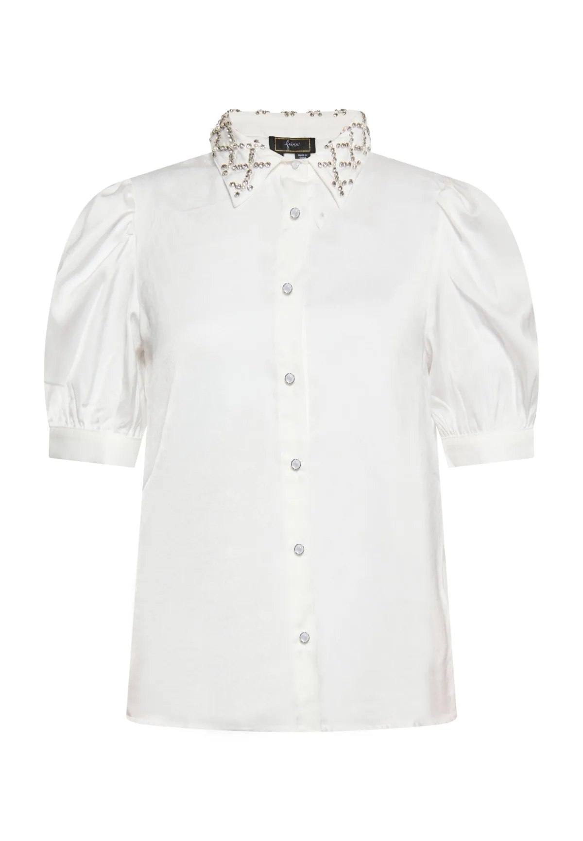Maak kennis met een verfijnde satijnen blouse met een gestructureerd ontwerp en een juwelenpatroon op de kraag. Dit elegante overhemd heeft korte pofmouwen, waardoor het een volumineuze uitstraling heeft. De decoratieve knoopsluiting aan de voorkant draagt bij aan de chique uitstraling, terwijl de rechte zoom en het klassieke maatwerk een formele look creëren die perfect is voor elke gelegenheid. Dit product maakt deel uit van de Elegant Shirt-collectie overhemdblouse