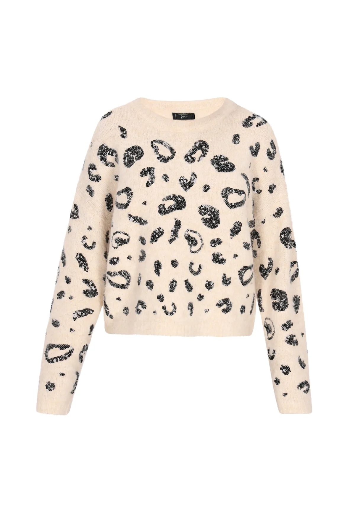 Design: Geribd ceintuurtje, Overcut schouder; Materiaal: Knitwear; Halstype: Ronde hals; Motief: Dierenprint; Details: Pailletten; Extra's: Applicaties; Pasvorm: Losse pasvorm; Armlengte: Lange mouw; Lengte: Normale lengte