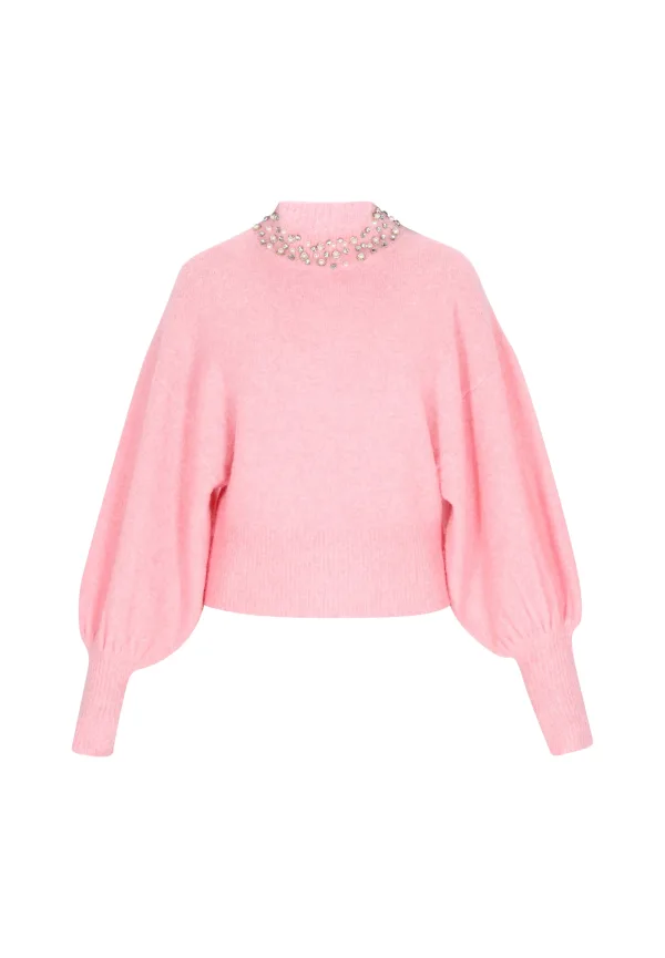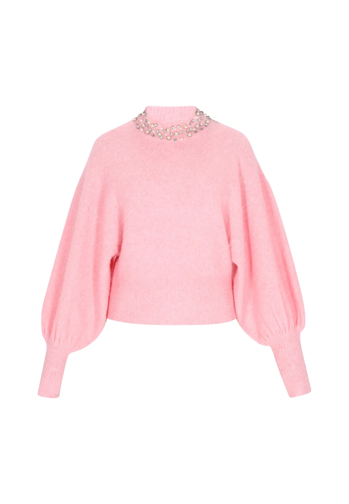Design: Pofmouwen, Geribd ceintuurtje; Type sluiting: Slip; Materiaal: Knitwear; Halstype: Opstaande kraag; Motief: Mélange; Details: Sierstenen, Parels; Extra's: Op staal naden, Met kristalparels/glazen parels; Pasvorm: Losse pasvorm; Armlengte: Lange mouw; Lengte: Normale lengte