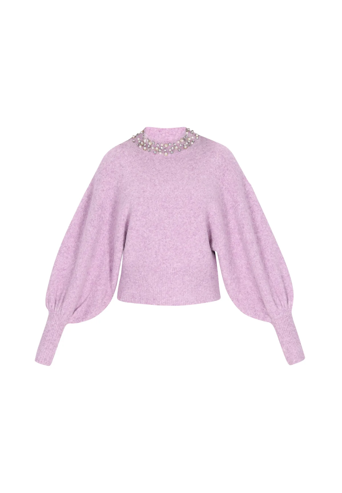 Design: Geribbelde kraag, Pofmouwen, Geribd ceintuurtje, Overcut schouder; Type sluiting: Slip; Materiaal: Knitwear; Halstype: Opstaande kraag; Motief: Mélange; Details: Sierstenen, Parels; Extra's: Fully fashioned, Met textuur, Voelt zacht aan; Pasvorm: Losse pasvorm; Armlengte: Lange mouw; Lengte: Normale lengte