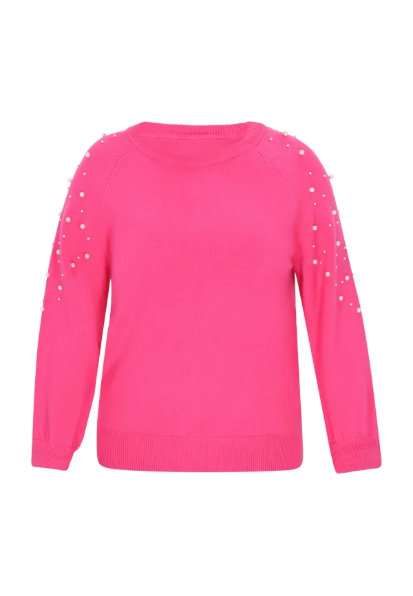 Verfijn je modieuze look met deze elegante plus-size trui! Met een ronde hals en lange raglanmouwen biedt hij een stijlvol silhouet. De geribbelde zoom zorgt voor een nauwsluitende pasvorm, terwijl de gebreide stof comfort garandeert. Versierd met chique parels langs de schouders, is dit effen exemplaar perfect voor elke gelegenheid in je collectie! Hij maakt deel uit van de Plus Size Collectie. Plus Size Trui