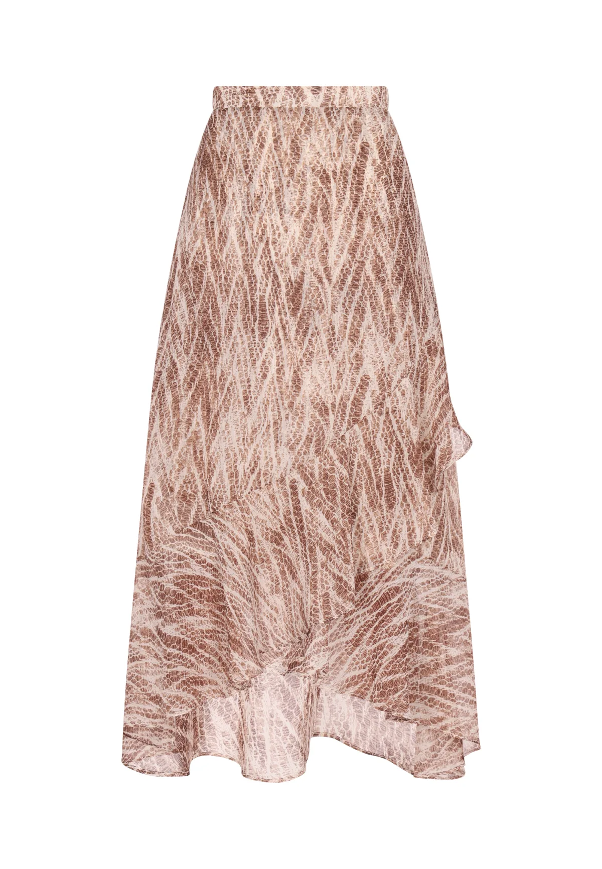 Geef je garderobe een boost met deze rok met hoge taille, voorzien van een uniek patroon dat de schoonheid van natuurlijke texturen nabootst. De A-lijn snit loopt elegant uit vanaf de taille, waardoor een flatterend silhouet ontstaat dat uitloopt naar de zoom. Een asymmetrische zoom voegt een vleugje dynamiek toe, met een kortere voorkant en langere achterkant voor een zwierige look. Rock