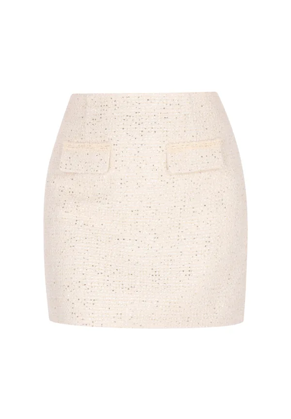Design: Opzet-/flapzak; Type sluiting: Ritssluiting; Materiaal: Bouclé; Rokvorm: Minirok; Details: Pailletten; Extra’s: Glitterend; Lengte: Kort/mini; Pasvorm: Slanke pasvorm