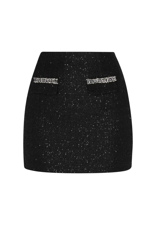Design: Opzet-/flapzak; Type sluiting: Ritssluiting; Materiaal: Bouclé; Motief: Effen; Rokvorm: Minirok; Details: Pailletten; Extra's: Glitterend; Lengte: Kort/mini; Pasvorm: Slanke pasvorm