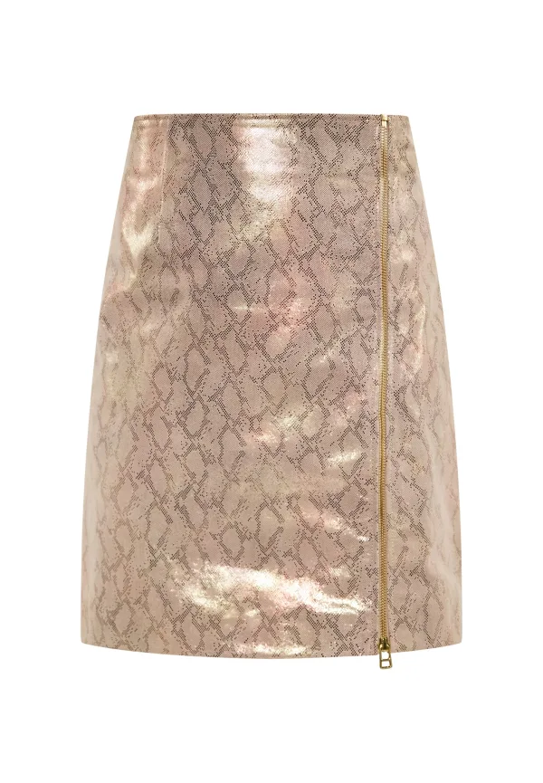 Deze leren minirok heeft een opvallend slangenprintpatroon dat lijkt op de reptielenhuid. Deze trapezerok heeft een aansluitende tailleband en een rechte, korte snit die eindigt boven de knieën en straalt een scherpe verfijning uit. De zichtbare ritssluiting in glanzend goud loopt van de tailleband tot aan de zoom, zodat je hem gemakkelijk kunt dragen. Met zijn gestructureerde en gedetailleerde look zal deze leren rok zeker het licht vangen, waar je ook gaat. Dit product maakt deel uit van de Snake Pattern Collection Rock