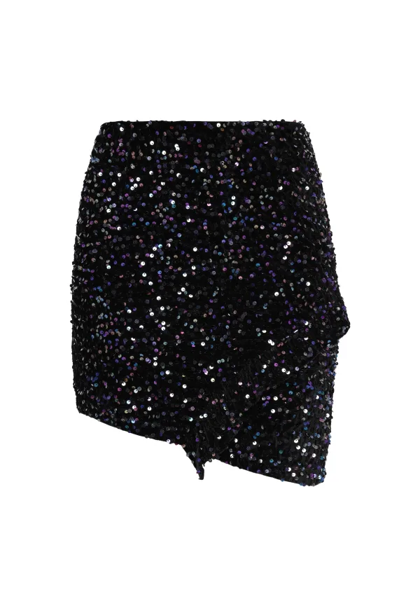 Design: Asymmetrische zoom; Type sluiting: Ritssluiting; Materiaal: Fluweel/Nicky Velours; Motief: Effen; Details: Pailletten, Ruches; Extra's: Glitterend, Op staal naden; Lengte: Kort/mini; Pasvorm: Slanke pasvorm
