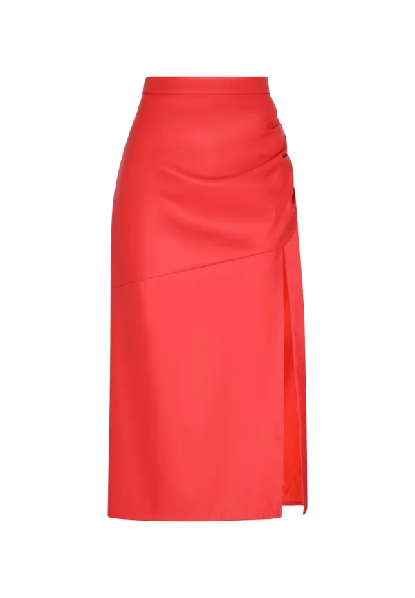 Design: Gevoerde zoom/rand; Type sluiting: Ritssluiting; Materiaal: Imitatieleder; Motief: Effen; Rokvorm: A-lijn rok; Details: Cut-outs, Gedrapeerd; Extra’s: Applicaties; Lengte: 3/4 lengte; Pasvorm: Aansluitende pasvorm