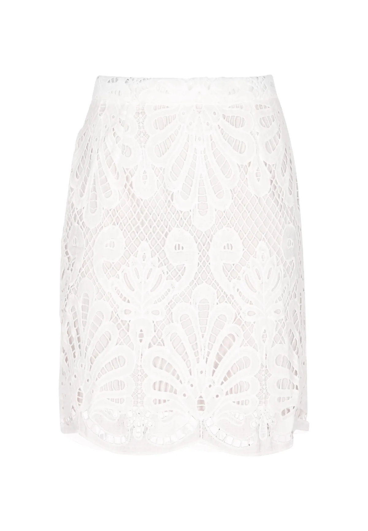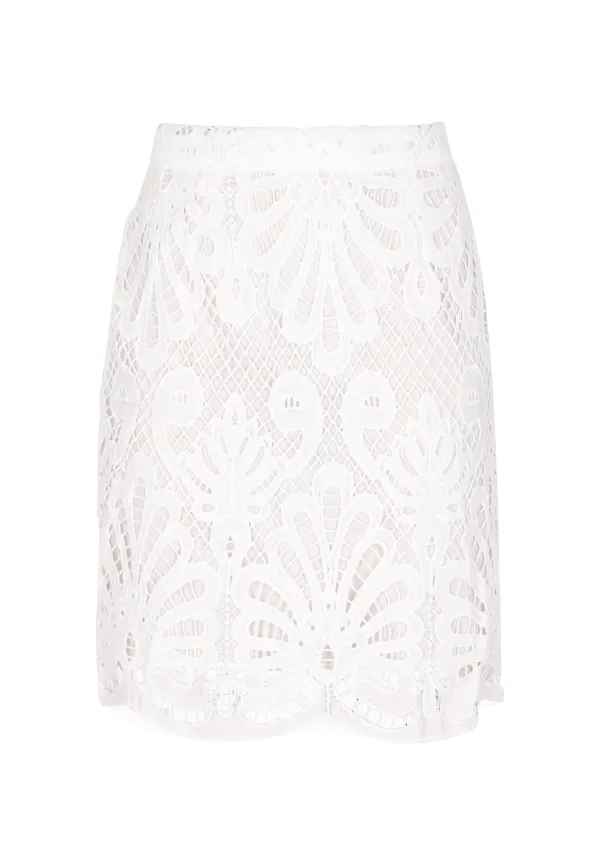 De met precisie vervaardigde kanten kokerrok met koord is een meesterwerk van elegantie. De ingewikkelde bloemen- en geometrische kanten overlay voegt een vleugje verfijning toe aan je cocktailkleding. Deze rok heeft een aansluitende tailleband en een A-lijnsilhouet en straalt charme en gratie uit. De geschulpte zoom volgt de contouren van het ontwerp van geribd kant, waardoor een verbluffende visuele impact ontstaat. Perfect voor elke gelegenheid waarbij u een statement wilt maken met uw stijl. Dit product maakt deel uit van de Summer Cocktail Collection Rock