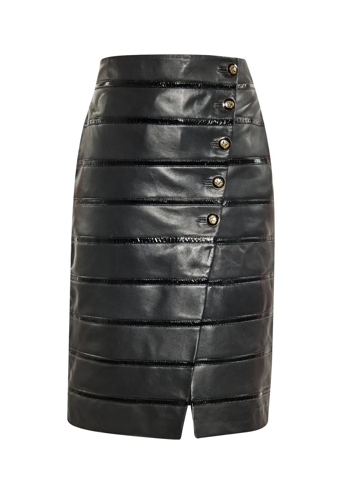 Geef je garderobe een boost met deze verfijnde leren kokerrok. Met horizontale panelen en gouden knopen aan de voorkant straalt deze midi-rok een moderne stijl uit. De aansluitende snit accentueert rondingen, terwijl de split aan de achterzijde zorgt voor bewegingsvrijheid. Compleet met zichtbare ritsdetails voor een scherp accent, deze rok is een must-have voor wie op zoek is naar een modieuze esthetiek. Rock