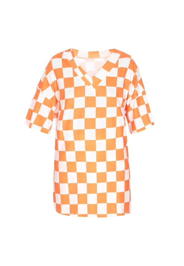 Design: Overcut schouder; Materiaal: Jersey; Halstype: V-hals; Motief: Geruit; Extra's: All-over patroon; Pasvorm: Losse pasvorm; Armlengte: Halve mouw; Lengte: Lange pasvorm