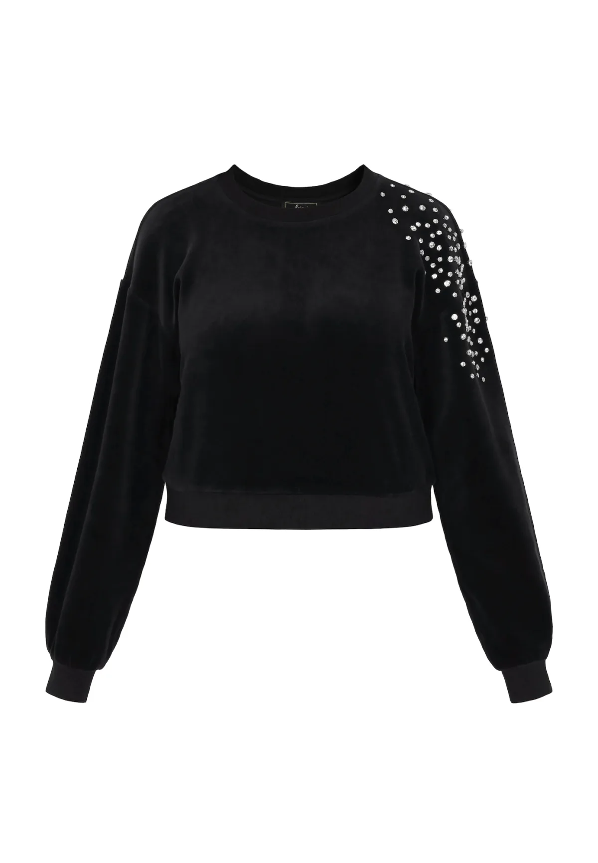 Design: Geribbelde kraag, Geribd ceintuurtje, Overcut schouder, Nektape; Materiaal: Fluweel/Nicky Velours; Halstype: Ronde hals; Motief: Effen; Details: Sierstenen; Extra's: Applicaties, Op staal naden, Voelt zacht aan; Pasvorm: Losse pasvorm; Armlengte: Lange mouw; Lengte: Korte pasvorm