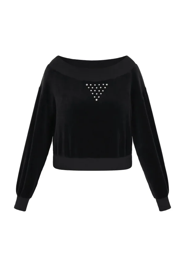Design: Geribd ceintuurtje; Materiaal: Fluweel/Nicky Velours; Halstype: Boothals; Motief: Motiefprint; Details: Sierstenen, Gedrapeerd; Extra's: Op staal naden; Pasvorm: Losse pasvorm; Armlengte: Lange mouw; Lengte: Korte pasvorm