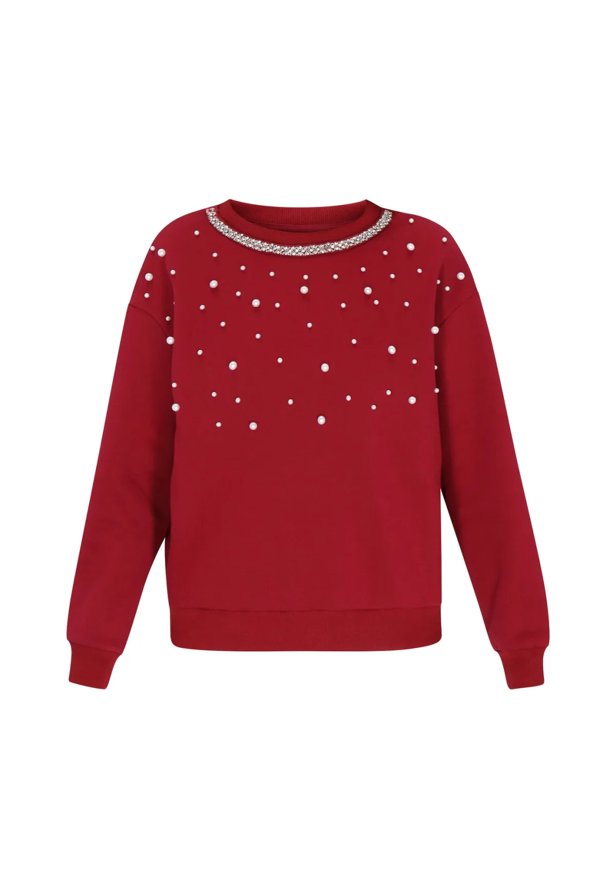 Design: Geribd ceintuurtje; Type sluiting: Slip; Materiaal: Sweatstof; Halstype: Ronde hals; Motief: Effen; Details: Sierstenen, Parels; Extra's: Voelt zacht aan; Pasvorm: Losse pasvorm; Armlengte: Lange mouw; Lengte: Normale lengte