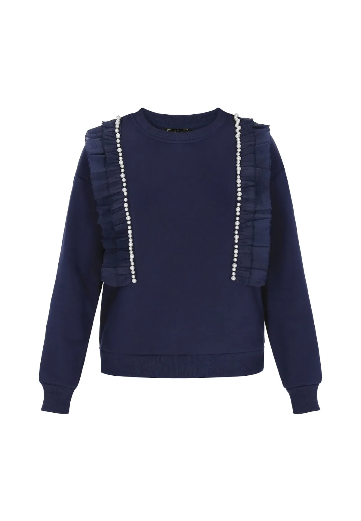 Design: Geribbelde kraag, Geribd ceintuurtje; Materiaal: Sweatstof; Halstype: Ronde hals; Details: Ruches, Parels; Extra's: Applicaties, Voelt zacht aan; Pasvorm: Losse pasvorm; Armlengte: Lange mouw; Lengte: Normale lengte