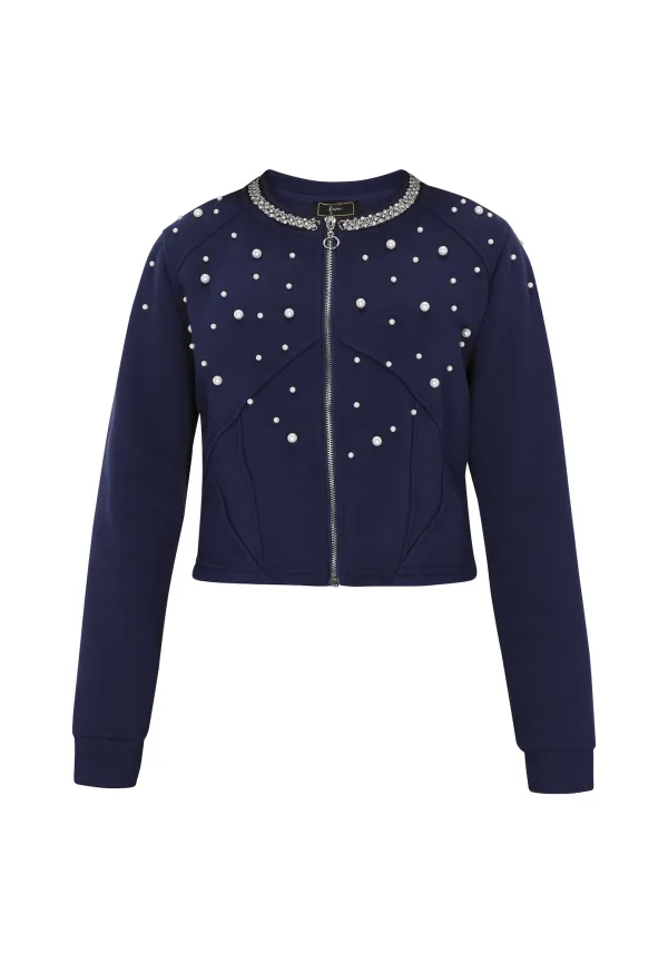 Design: Ritssluiting, Geribd ceintuurtje; Type sluiting: Ritssluiting; Materiaal: Sweatstof; Halstype: Ronde hals; Motief: Effen; Details: Sierstenen, Parels; Extra's: Op staal naden; Pasvorm: Normale pasvorm; Armlengte: Lange mouw; Lengte: Korte pasvorm