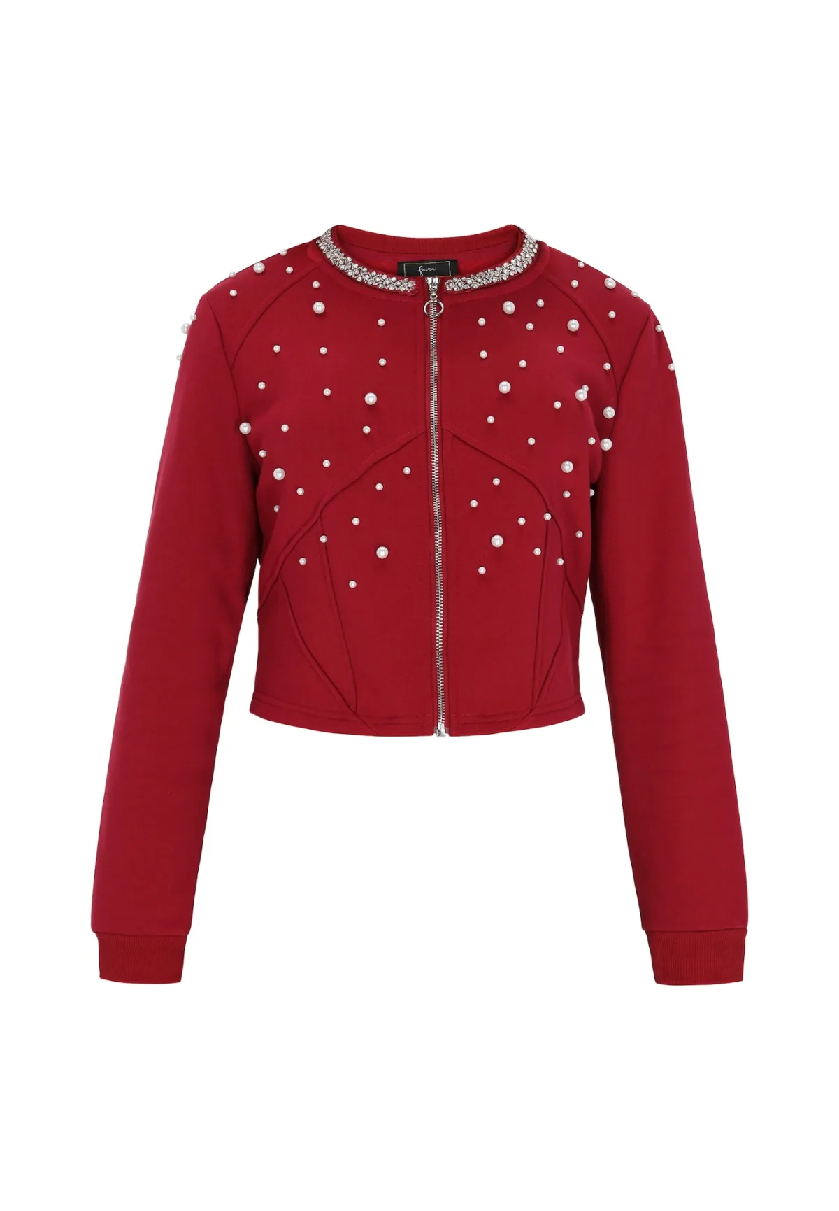 Design: Ritssluiting, Geribd ceintuurtje; Type sluiting: Ritssluiting; Materiaal: Sweatstof; Halstype: Ronde hals; Motief: Effen; Details: Sierstenen, Parels; Extra's: Label patch/label flag, Op staal naden; Pasvorm: Normale pasvorm; Armlengte: Lange mouw; Lengte: Korte pasvorm