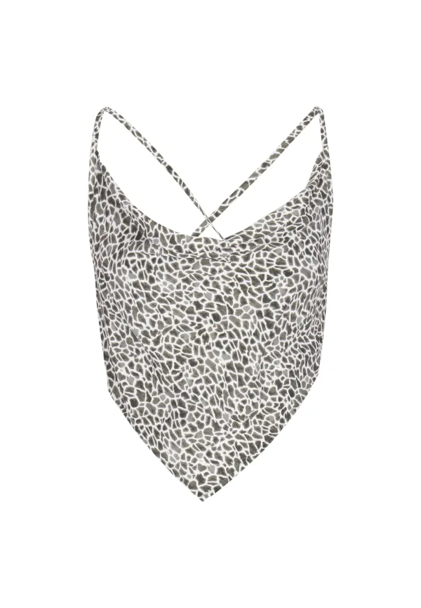 Design: Gevoerde zoom/rand; Materiaal: Viscose; Halstype: Watervalhals; Motief: Dierenprint; Soort bandjes: Spaghettibandjes; Details: Plooien, Backless; Extra's: All-over patroon; Pasvorm: Slanke pasvorm; Armlengte: Mouwloos; Lengte: Korte pasvorm