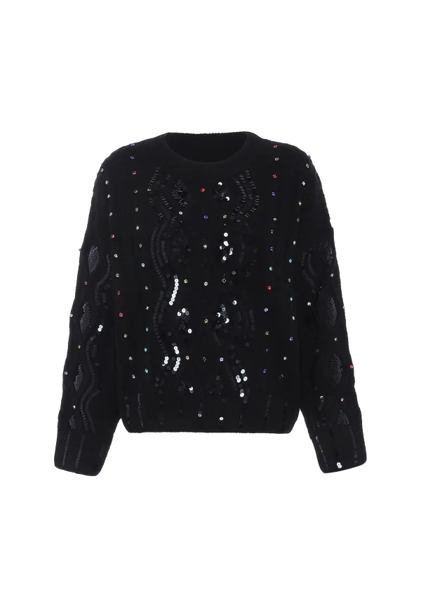 Geef je garderobe een boost met deze gebreide trui met ronde hals en lange mouwen. Dit kledingstuk, verfraaid met ingewikkelde paillettenpatronen, straalt een feestelijke charme uit die perfect is voor casual tot semi-formele gelegenheden. De geribbelde details aan de halslijn, manchetten en zoom voegen structuur toe aan het algehele ontwerp en maken het een opvallende toevoeging aan je collectie. Pullover trui