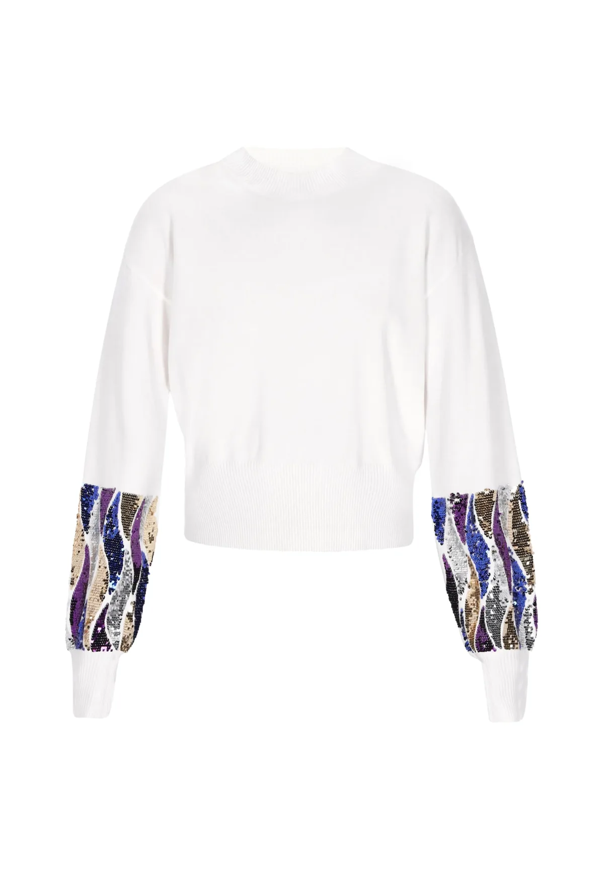 Design: Pofmouwen; Type sluiting: Slip; Materiaal: Knitwear; Halstype: Opstaande kraag; Motief: Color-Blocking; Details: Pailletten; Extra's: Fully fashioned; Pasvorm: Normale pasvorm; Armlengte: Lange mouw; Lengte: Normale lengte