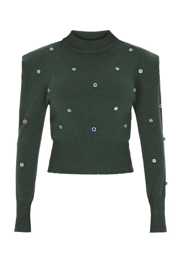 Ontdek deze stijlvolle trui met hoge hals en geribde details aan de zoom, manchetten en kraag. Versierd met decoratieve versieringen, waaronder ronde accenten die kunstig over de stof zijn geplaatst. De hoge ronde hals zorgt voor een aansluitende pasvorm die eigentijdse elegantie en charme uitstraalt. Trui met lange mouwen en geribde manchetten. Jumper