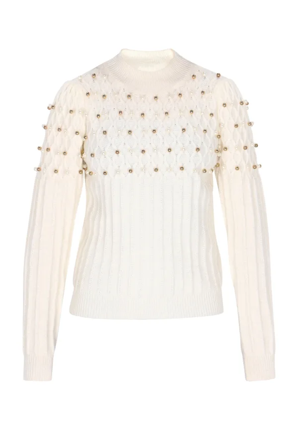 Design: Geribbelde kraag, Geribd ceintuurtje; Materiaal: Knitwear; Halstype: Opstaande kraag; Motief: Effen; Details: Parels; Extra's: Patroon gebreid, Met textuur, Met gekweekte parels; Pasvorm: Normale pasvorm; Armlengte: Lange mouw; Lengte: Normale lengte