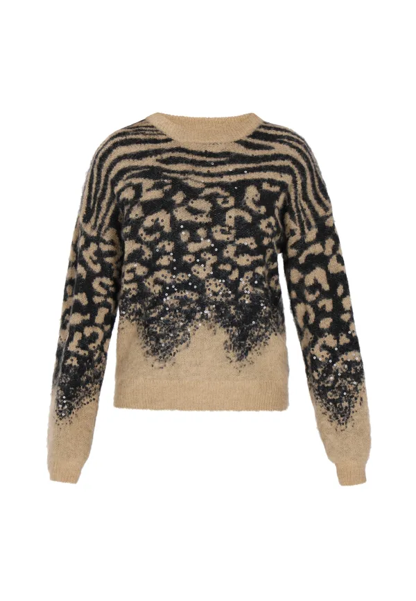 Design: Geribbelde kraag, Rechte zoom, Recht model, Geribd ceintuurtje; Type sluiting: Slip; Halstype: Ronde hals; Motief: Dierenprint; Details: Pailletten; Extra's: Glinsterend, Voelt zacht aan; Pasvorm: Wijde pasvorm; Armlengte: Lange mouw; Lengte: Normale lengte