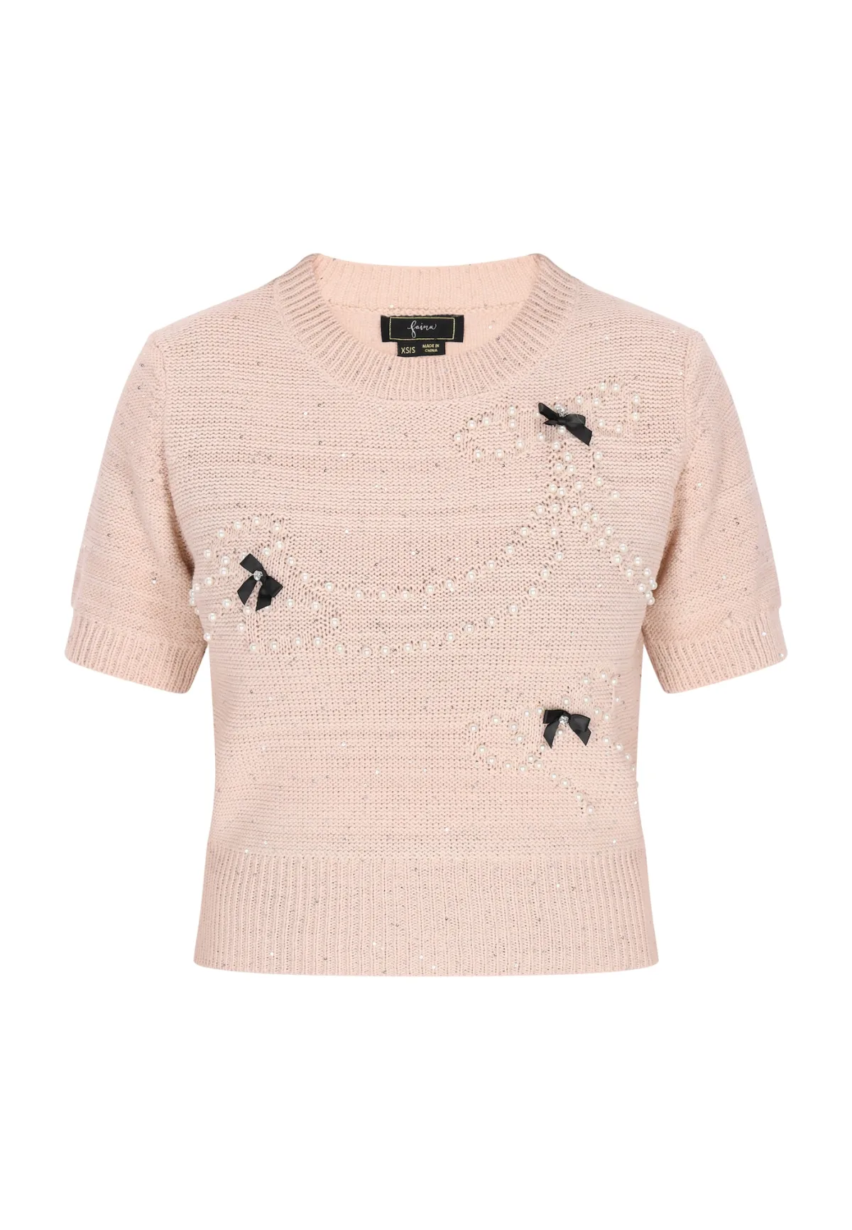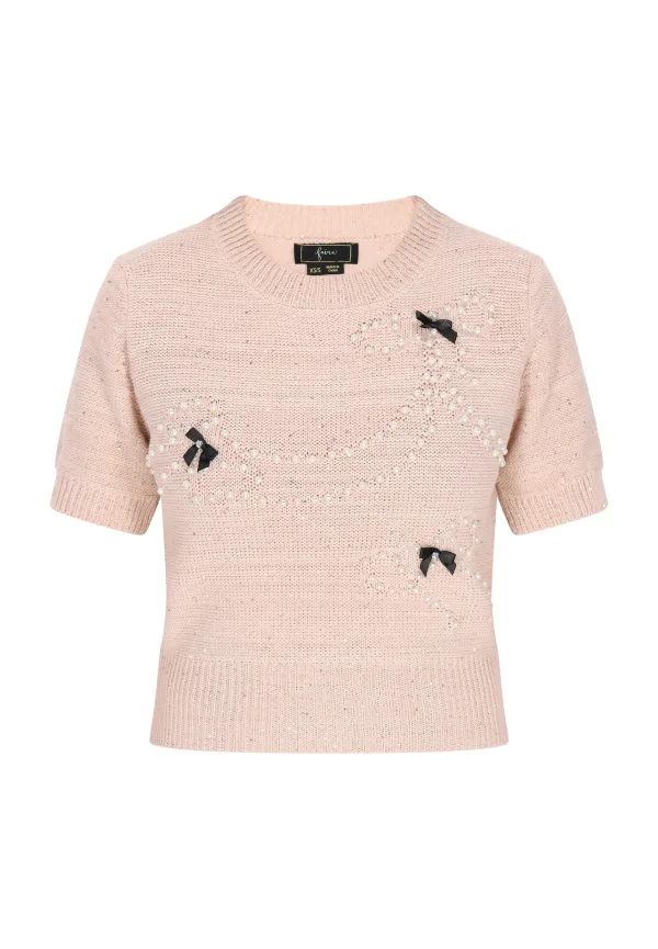 Design: Geribbelde kraag; Materiaal: Knitwear; Halstype: Ronde hals; Motief: Effen; Details: Sierstenen, Parels; Extra's: Fully fashioned; Pasvorm: Slanke pasvorm; Armlengte: Kwartmouw; Lengte: Normale lengte