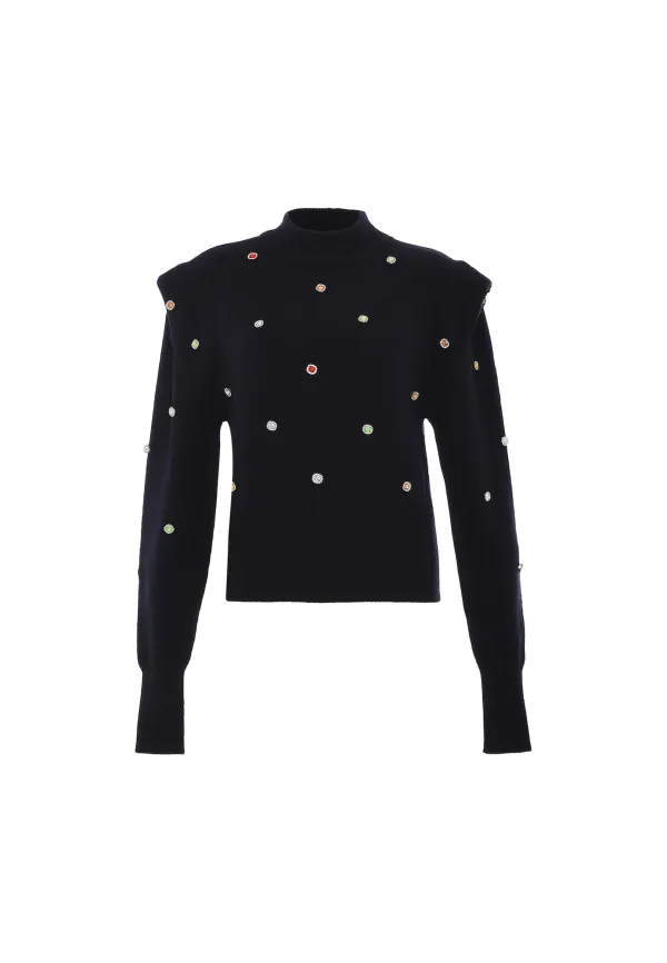 Dompel jezelf onder in de voortreffelijke allure van deze coltrui, een waar meesterwerk van design. De geribbelde textuur op de kraag, manchetten en zoom voegt een vleugje verfijning toe aan het nauwsluitende silhouet. Versierd met een verscheidenheid aan kleine ronde versieringen in verschillende artistieke ontwerpen, straalt deze trui elegantie en charme uit. Perfect voor wie unieke en decoratieve stukken waardeert die moeiteloos een statement maken. Pullover trui