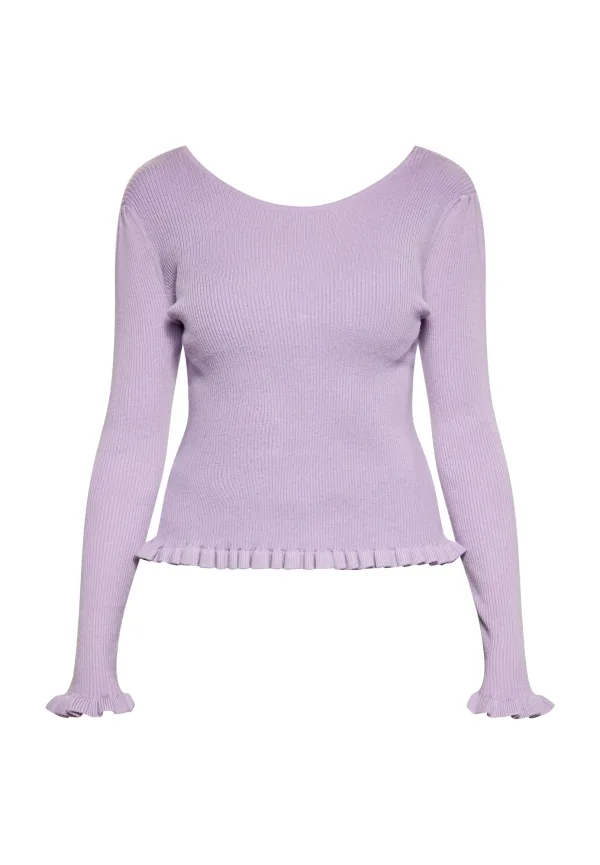 Geef je garderobe een boost met deze elegante gebreide trui met een brede, ronde halslijn en lange mouwen. De ruches aan de zoom en manchetten voegen een vleugje verfijning en vrouwelijkheid toe. Het aansluitende silhouet wordt aangevuld door een aantrekkelijk open rugontwerp, waardoor het perfect is voor zowel casual uitjes als speciale gelegenheden. Voeg een charmante twist toe aan je outfit met de delicate ruches en geribbelde textuur van deze stijlvolle trui. Jumper