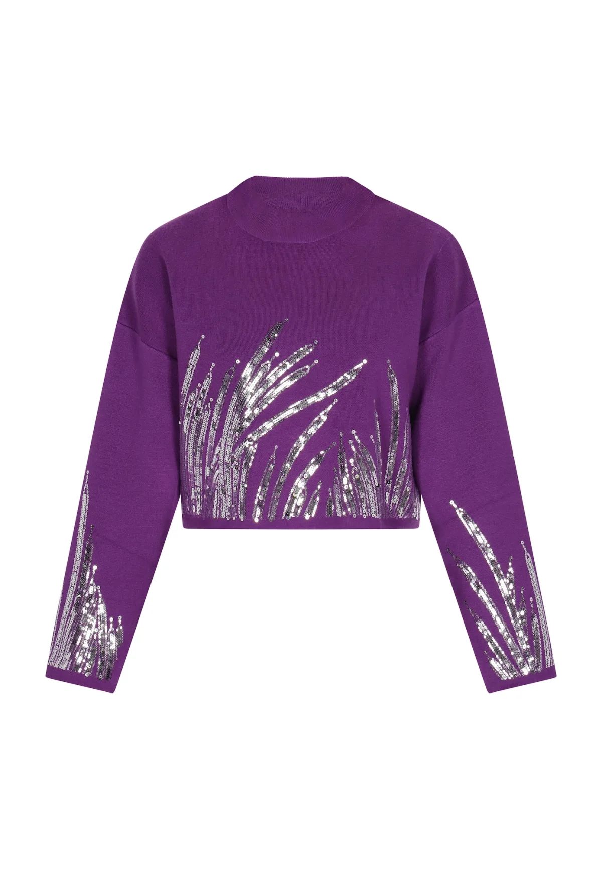 Design: Geribbelde kraag, Rechte zoom, Overcut schouder; Materiaal: Knitwear; Halstype: Opstaande kraag; Details: Pailletten; Extra's: Glinsterend, Applicaties, Voelt zacht aan; Pasvorm: Losse pasvorm; Armlengte: Lange mouw; Lengte: Korte pasvorm