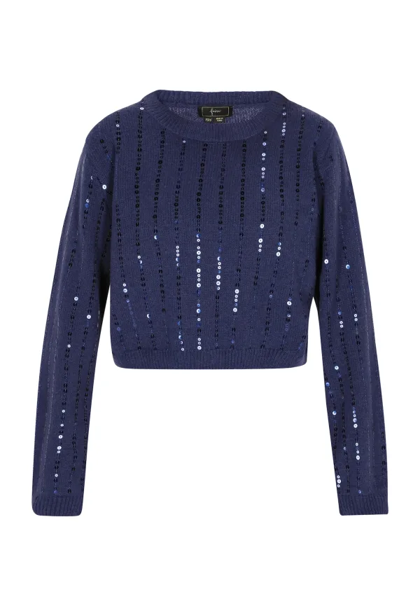 Design: Geribbelde kraag, Overcut schouder; Materiaal: Knitwear; Halstype: Ronde hals; Motief: Effen; Details: Pailletten; Extra's: Glitterend, Applicaties, Fully fashioned; Pasvorm: Losse pasvorm; Armlengte: Lange mouw; Lengte: Korte pasvorm