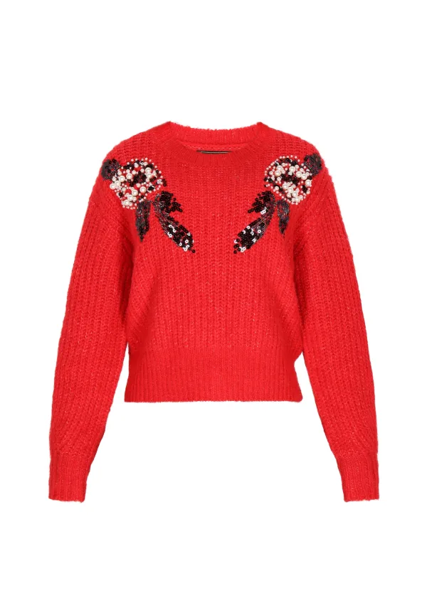 Design: Geribbelde kraag; Type sluiting: Slip; Materiaal: Knitwear; Halstype: Ronde hals; Motief: Bloemenprint; Details: Pailletten, Parels; Extra's: Glitterend, Label patch/label flag, Voelt zacht aan; Pasvorm: Losse pasvorm; Armlengte: Lange mouw; Lengte: Normale lengte
