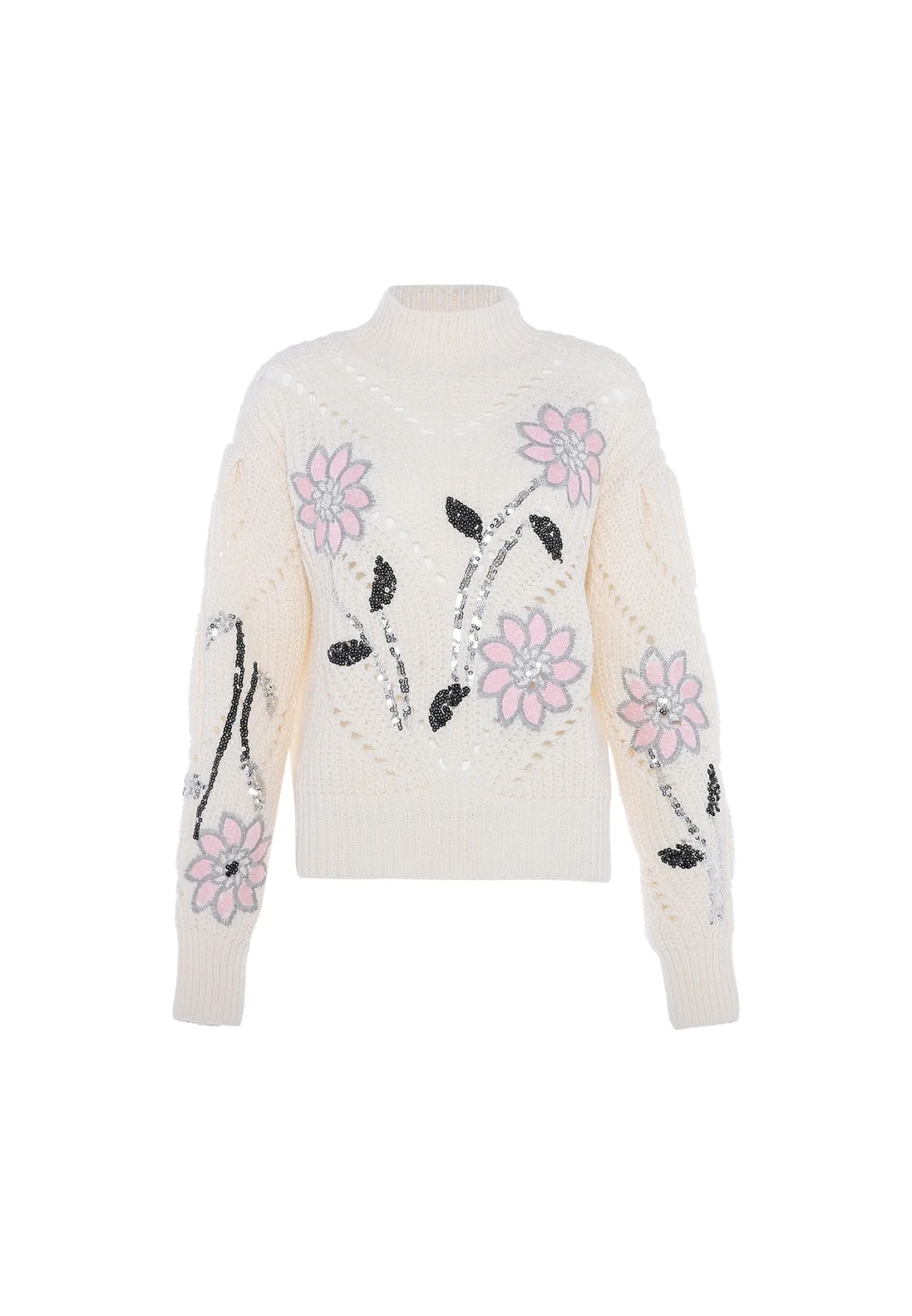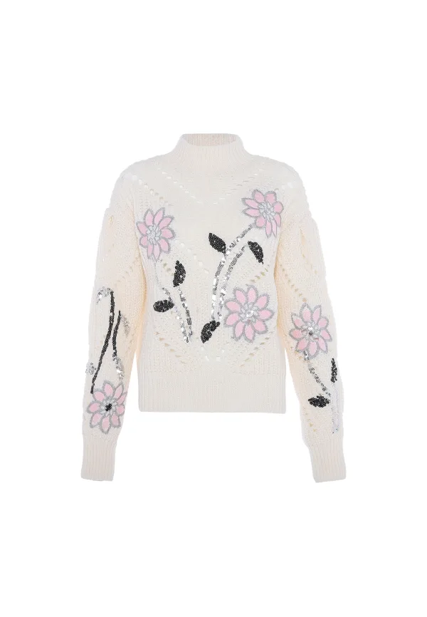 Deze gebreide trui is vervaardigd met nauwgezette aandacht voor detail en heeft een geribde col en lange mouwen. Versierd met uitgebreide bloemenborduursels, pailletten en kralen, straalt het elegantie uit. Het kortere silhouet en het dikke breisel bieden zowel stijl als warmte. Fijne versieringen creëren een fascinerend motief dat doet denken aan bloeiende bloemen, waardoor dit kledingstuk een hoogtepunt is in elke garderobe. Pullover trui