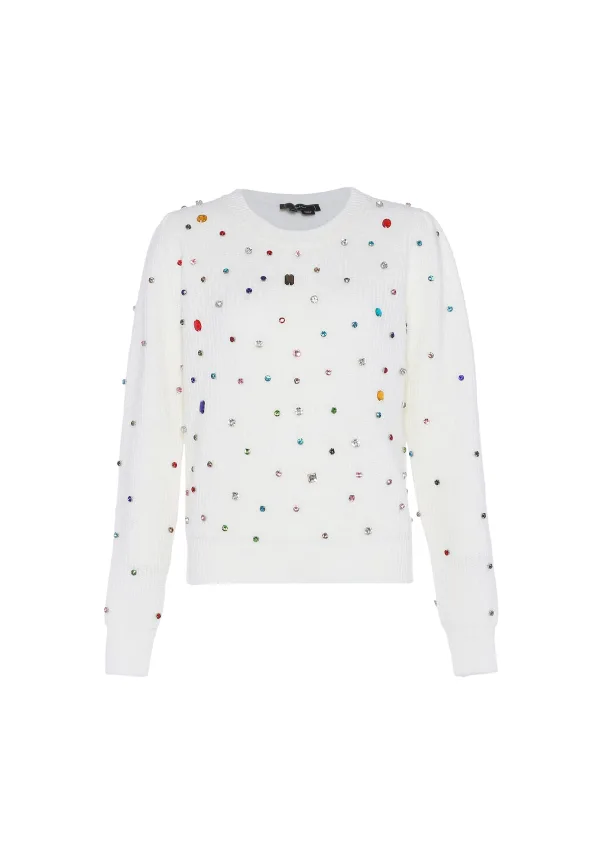 Verfijn je stijl met deze elegante trui met een normale pasvorm en ronde hals. De lange mouwen lopen taps toe naar de polsen voor een comfortabele maar toch chique look. De geribbelde gebreide stof, versierd met veelkleurige strass-steentjes, zorgt voor extra textuur, terwijl het eenvoudige ontwerp hem veelzijdig maakt. Perfect voor zowel avond- als vrijetijdskleding, dit is een must-have uit de Fashion Look-collectie! Pullover trui