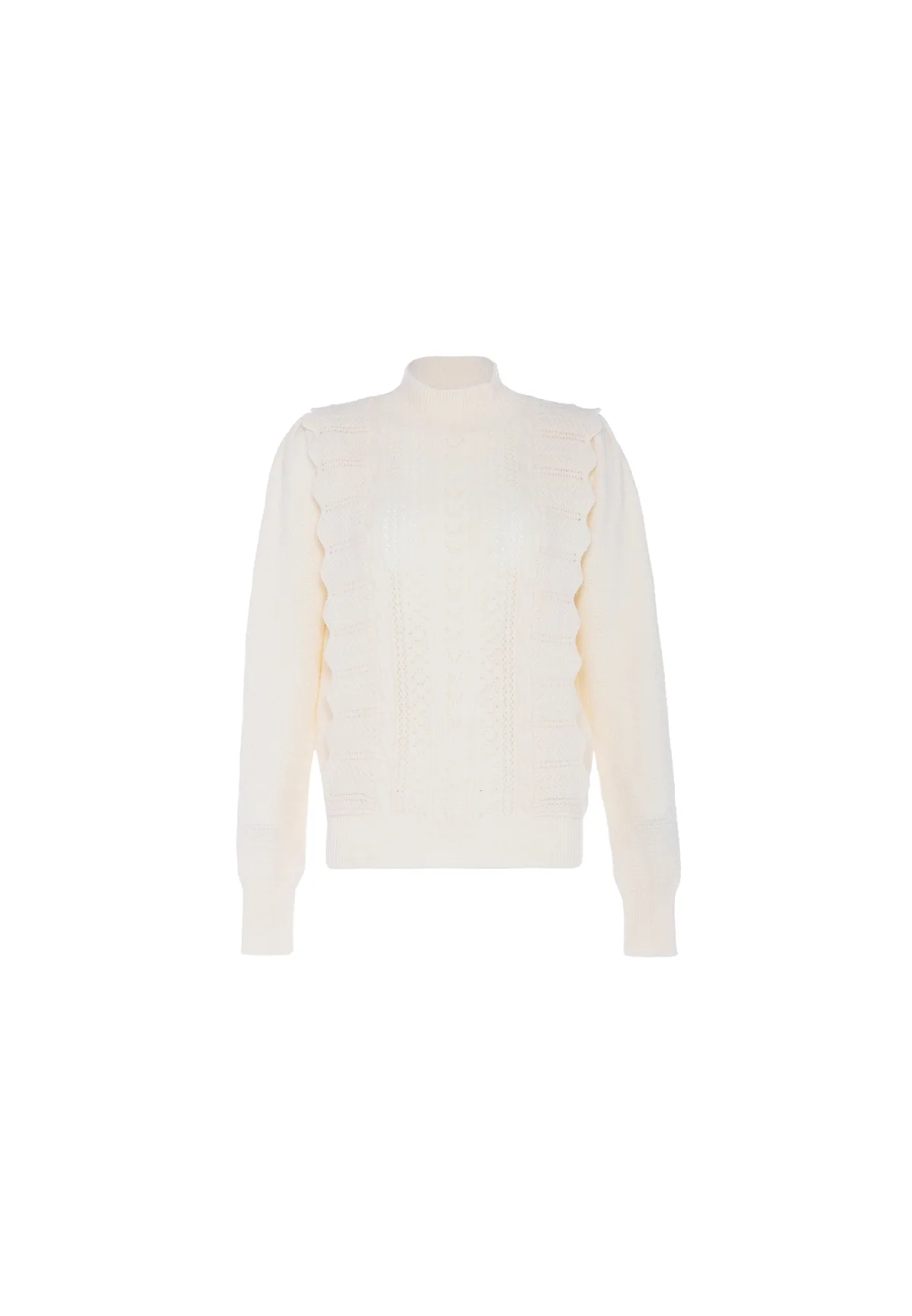 Deze trui van faina is uitgevoerd in een romantisch ajour breisel met ruches en opstaande kraag. Geribbelde uiteinden complementeren het ontwerp. Pullover trui