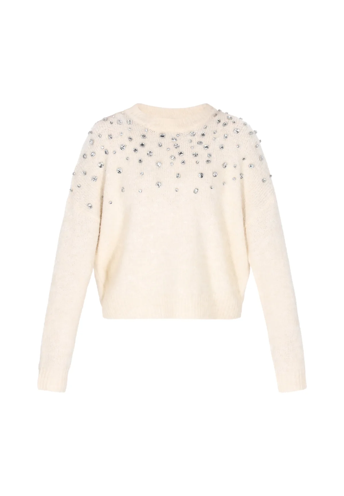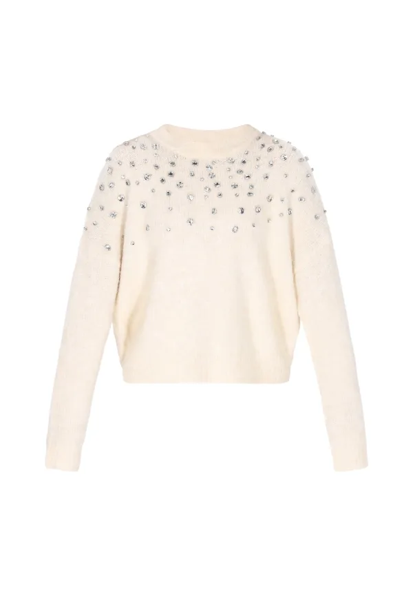 Design: Geribbelde kraag, Geribd ceintuurtje; Type sluiting: Slip; Materiaal: Knitwear; Halstype: Ronde hals; Motief: Effen; Details: Sierstenen; Extra's: Glitterend, Applicaties; Pasvorm: Losse pasvorm; Armlengte: Lange mouw; Lengte: Normale lengte