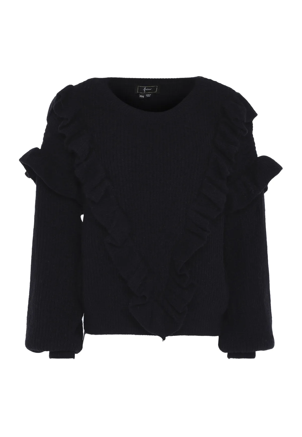 Deze faina trui maakt indruk met zijn ruches op de mouw en aan de voorkant. Het brede geribde breiwerk, de wijde mouwen en de ronde hals complementeren het ontwerp. Pullover trui