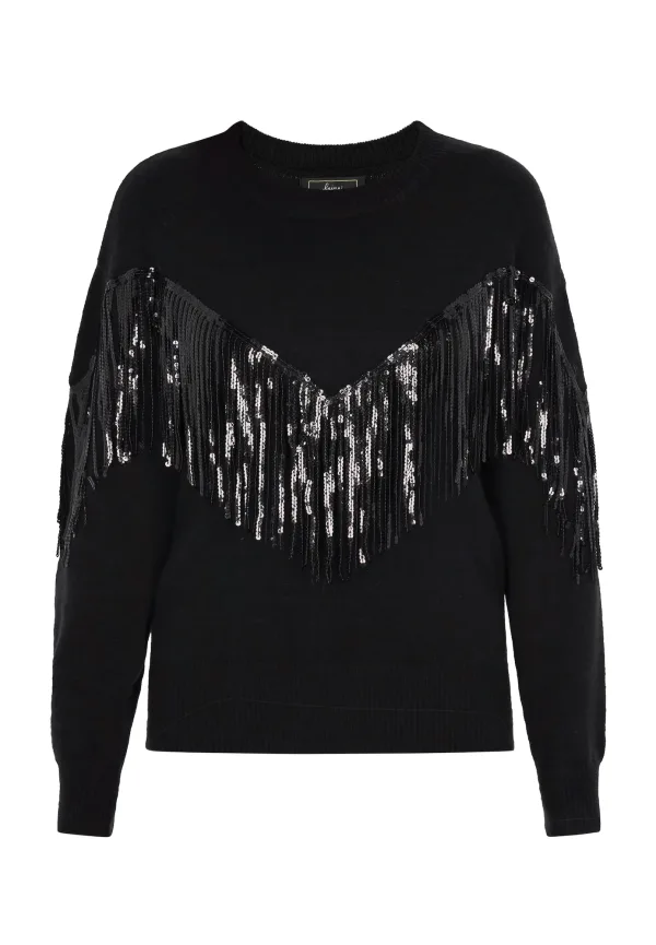 Een stijlvolle trui met ronde hals en lange mouwen. De geribde zoom, manchetten en kraag voegen structuur toe aan het ontwerp. Een opvallend decoratief element met glanzende verlengingen creëert een franje-achtig effect in een V-patroon over de borst en schouders, wat textuur en glamour toevoegt aan dit chique kledingstuk. Jumper