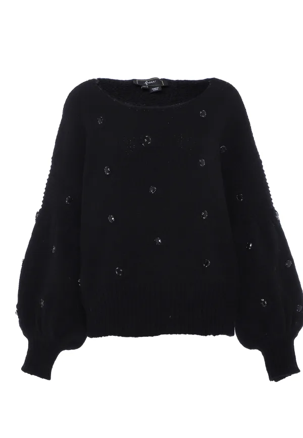 Met deze trui van faina heb je een echt pareltje in je garderobe. Het is gemaakt van zacht garen en heeft grote strass-steentjes aan de voorkant en op de wijde trompetmouwen. Pullover trui