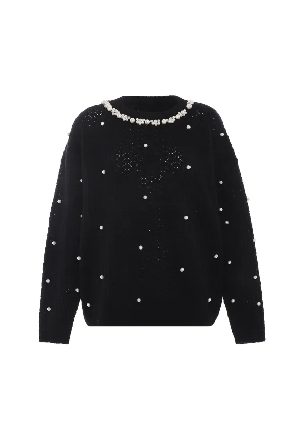 Maak kennis met een losvallende trui met een ronde hals en lange mouwen die taps toelopen bij de polsen. Versierd met pareldetails rond de halslijn en een ajourmotief voor een elegante en stijlvolle look. Gemaakt van zachte jersey, biedt dit item comfort en een modieuze look, geschikt voor dagelijks gebruik. Het maakt deel uit van de Fashion Look-collectie. Pullover trui