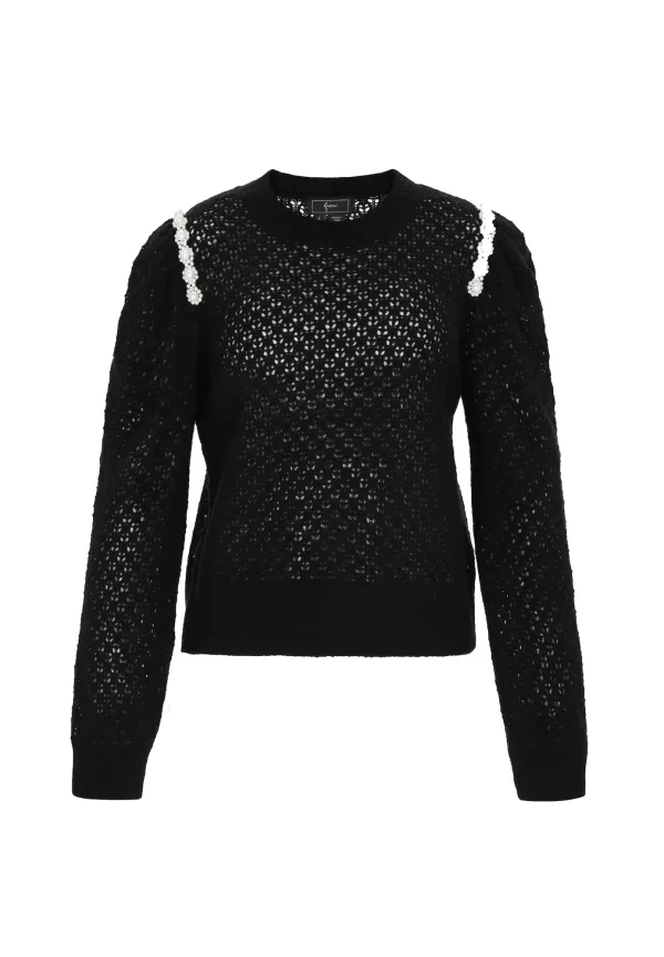 Design: Geribbelde kraag, Geribd ceintuurtje; Materiaal: Knitwear; Halstype: Ronde hals; Motief: Effen; Details: Mesh, Parels; Extra's: Licht transparant, Voelt zacht aan; Pasvorm: Normale pasvorm; Armlengte: Lange mouw; Lengte: Normale lengte