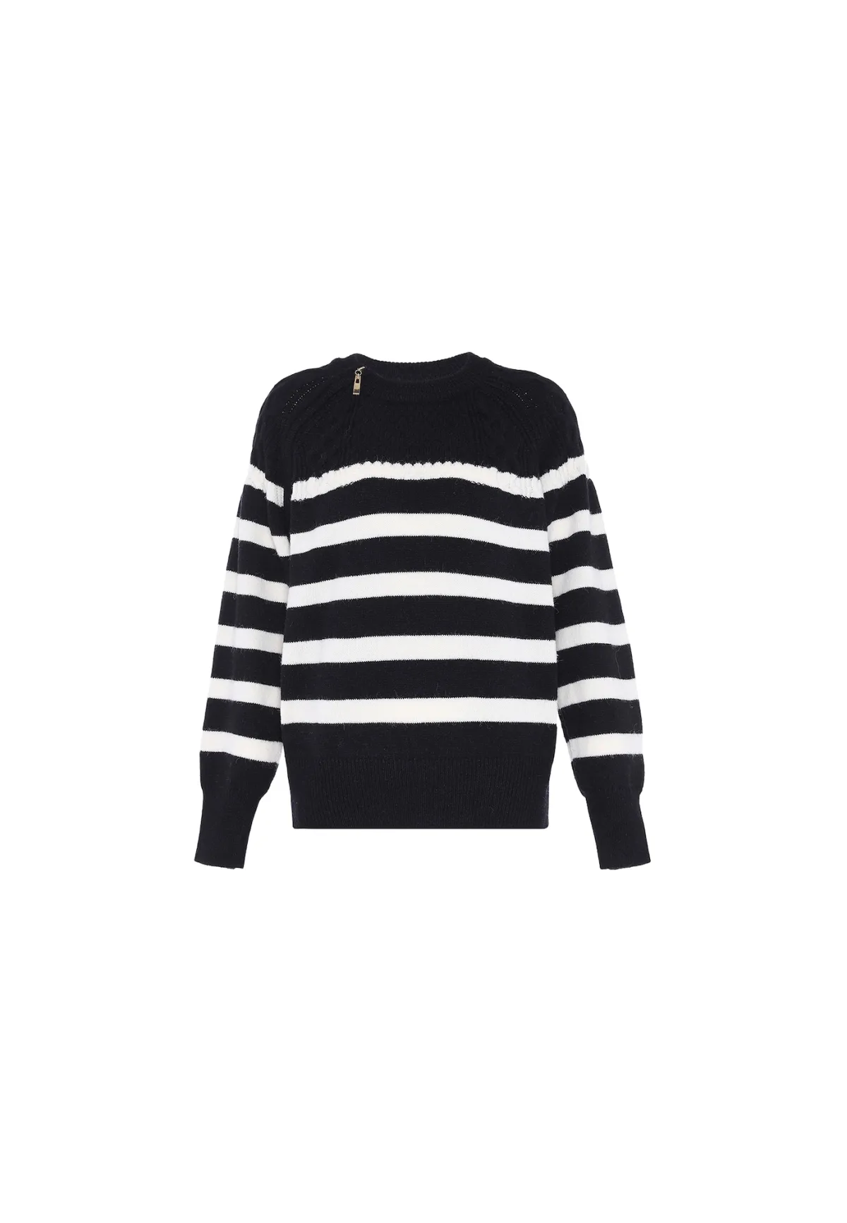 Maak kennis met een gebreide trui met een klassieke ronde hals en lange lantaarnmouwen. De normale pasvorm zorgt voor comfort, terwijl de decoratieve rits een modieuze touch toevoegt. Met een kabel- en streeppatroon is dit item uit onze Comfy-collectie perfect voor elke dag en biedt het stijl en warmte op koudere dagen. Pullover trui