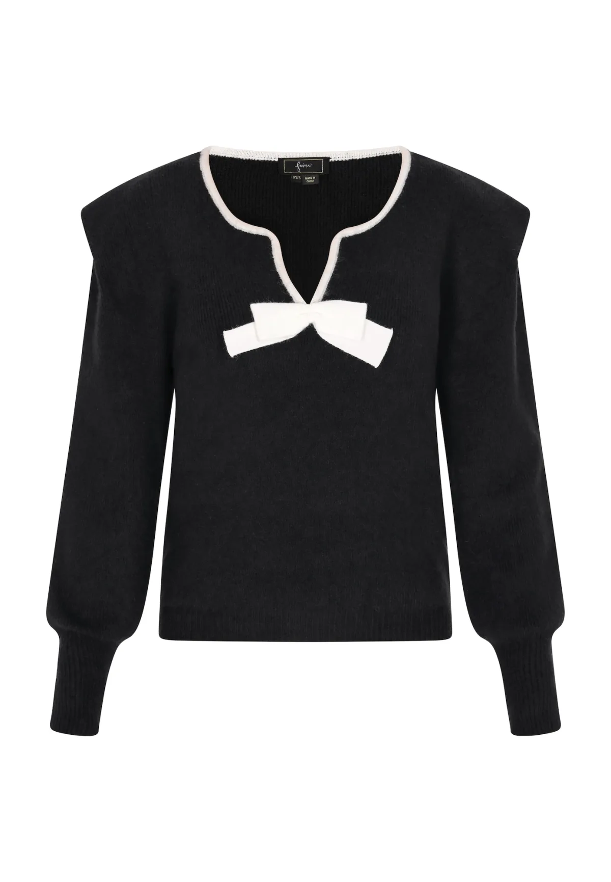 Geef je stijl een boost met deze elegante gebreide trui, met lange mouwen en charmante strik. De geribde halslijn en manchetten versterken het verfijnde ontwerp, de V-vormige halslijn is versierd met contrasterende kleuren. Wij raden dit model aan voor elegante gelegenheden. Jumper