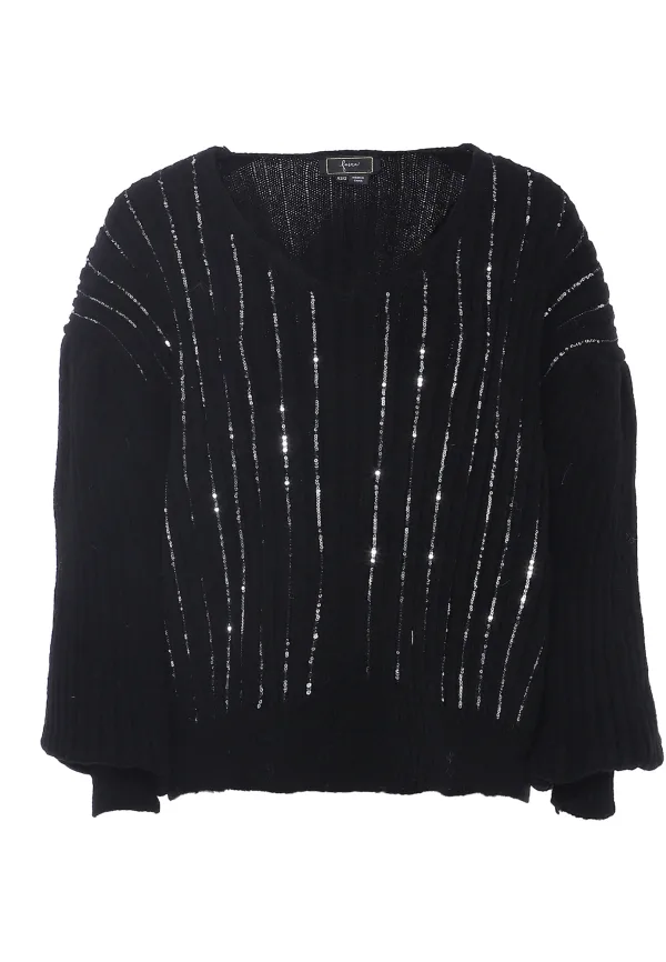 Een beetje glitter is nooit een slecht idee tijdens avondevenementen. De zachte trui van faina heeft met zijn rijen pailletten zeker een glanzende uitstraling. Een diepe V-hals en verlaagde schouders met plooien maken het ontwerp compleet. Pullover trui