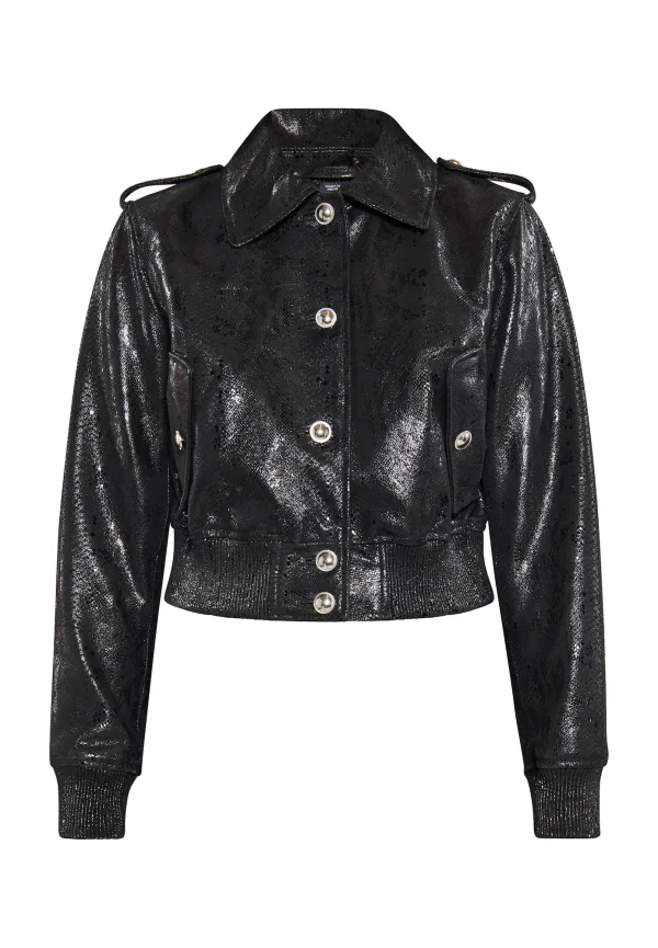 Maak kennis met een kort, glanzend leren jack dat een chique en elegante sfeer uitstraalt. Dit getextureerde jasje heeft een klassieke kraag, een decoratieve knoopsluiting aan de voorkant en twee borstzakken met klep met knoop. Het rechte passtuk aan de achterkant complementeert de lange mouwen die eindigen in geribde manchetten. De geribde tailleband geeft dit jasje met ronde hals een stijlvol tintje en combineert casual en edgy elementen naadloos voor een onderscheidende look. Dit product maakt deel uit van de Shiny Black Snake-collectie Jas