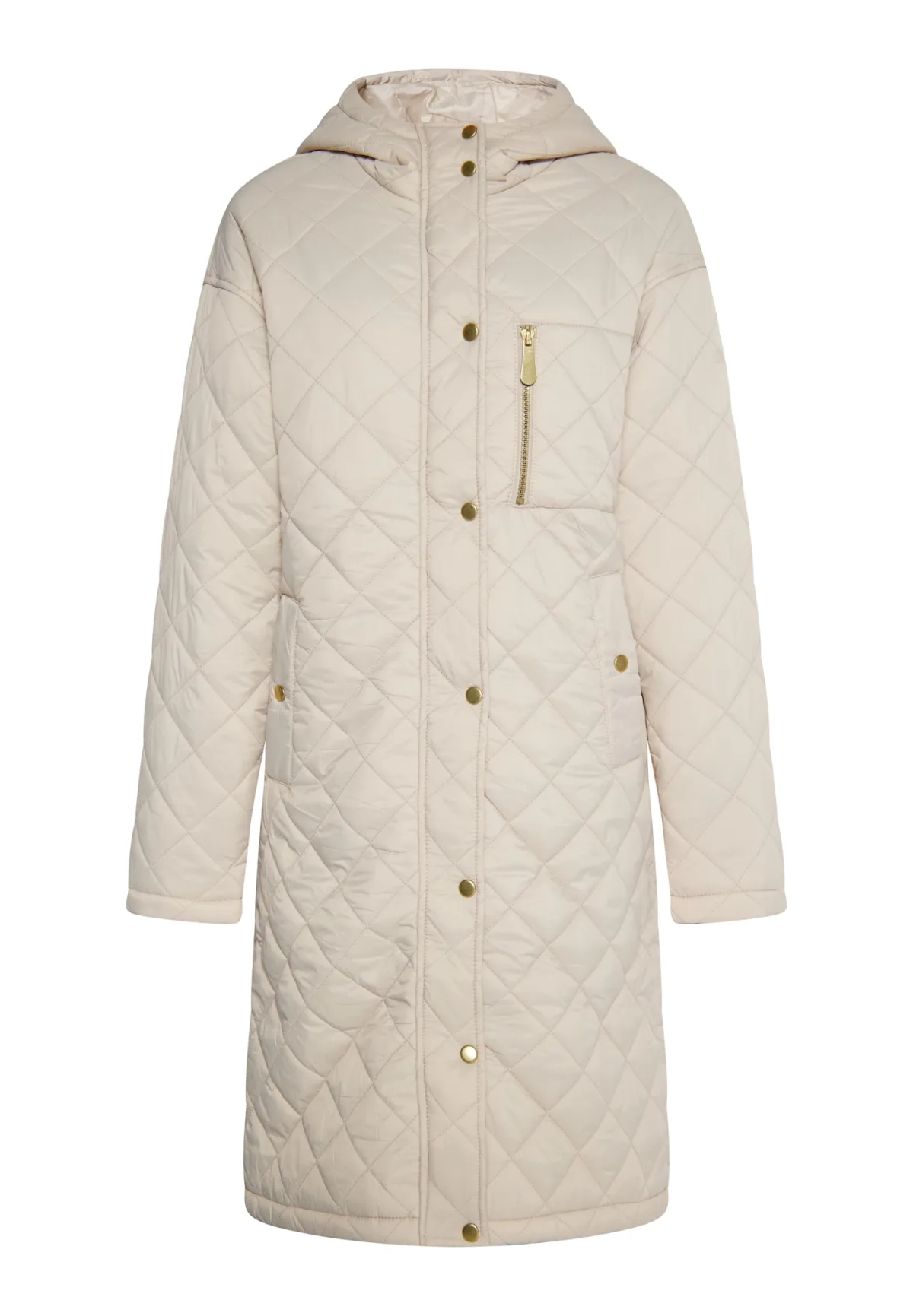 Deze elegante jas van Faina is gemaakt met een diervriendelijk, synthetisch vulmateriaal en geheel voorzien van ruitvormige stiksels. Het losvallende model heeft een capuchon en een verborgen ritssluiting met drukknoopsluiting. De accessoires zijn gemaakt van goudkleurig metaal. longjacket