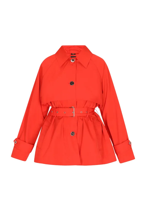 Type mantel: Trenchcoat; Design: Knop placket, Turn-down kraag, Zakken aan de zijkant, Tailleriem; Type sluiting: Knoopsluiting; Voering: Licht gevoerd; Motief: Effen; Extra's: Op staal naden, Gladde stof, Riemlussen; Pasvorm: Normale pasvorm; Lengte: Korte pasvorm