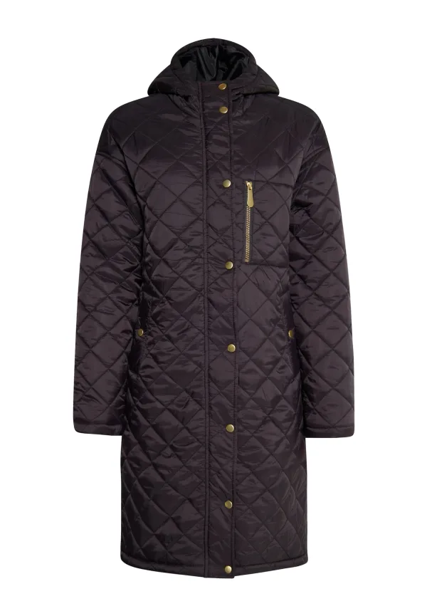 Deze elegante jas van Faina is gemaakt met een diervriendelijk, synthetisch vulmateriaal en geheel voorzien van ruitvormige stiksels. Het losvallende model heeft een capuchon en een verborgen ritssluiting met drukknoopsluiting. De accessoires zijn gemaakt van goud- en zilverkleurig metaal. longjacket
