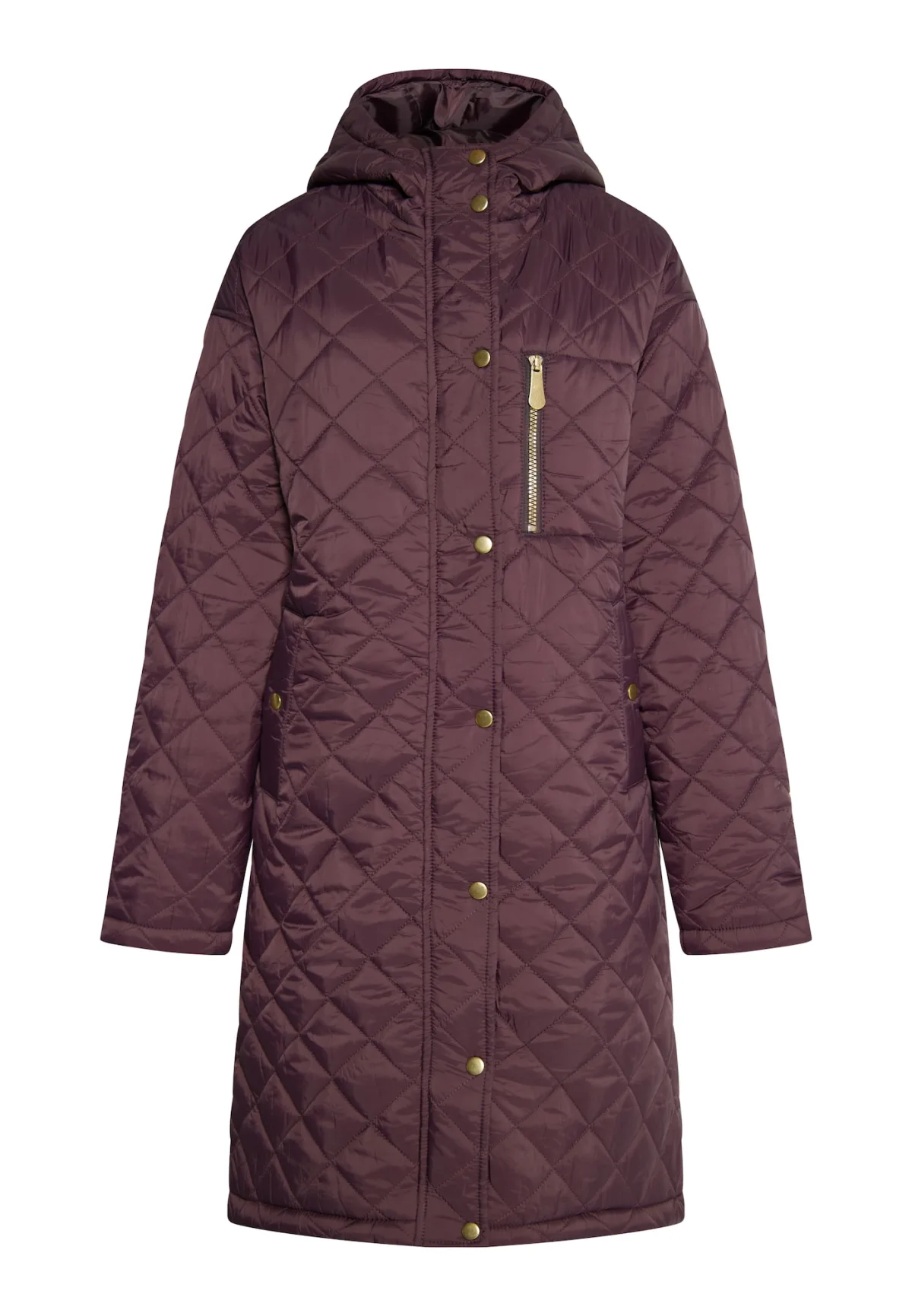 Deze elegante jas van Faina is gemaakt met een diervriendelijk, synthetisch vulmateriaal en geheel voorzien van ruitvormige stiksels. Het losvallende model heeft een capuchon en een verborgen ritssluiting met drukknoopsluiting. De accessoires zijn gemaakt van goud- en zilverkleurig metaal. longjacket