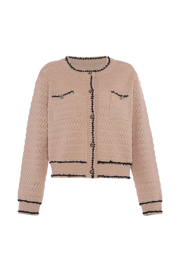 Geef je garderobe een boost met dit gebreide vest met structuurpatroon en ronde halslijn. De opening aan de voorkant is beveiligd met knopen, terwijl het taillelange ontwerp lange mouwen heeft voor extra warmte. Twee opgestikte zakken met flappen versierd met knopen bieden zowel stijl als functionaliteit. Jumper